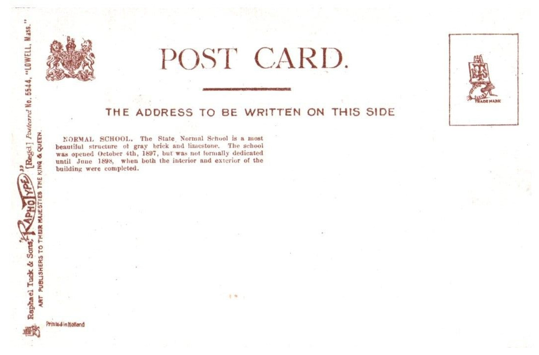 Condition: Pre-owned. Stored well. May have mild edgewear. Typical. Normal School Lowell Massachusetts Postcard