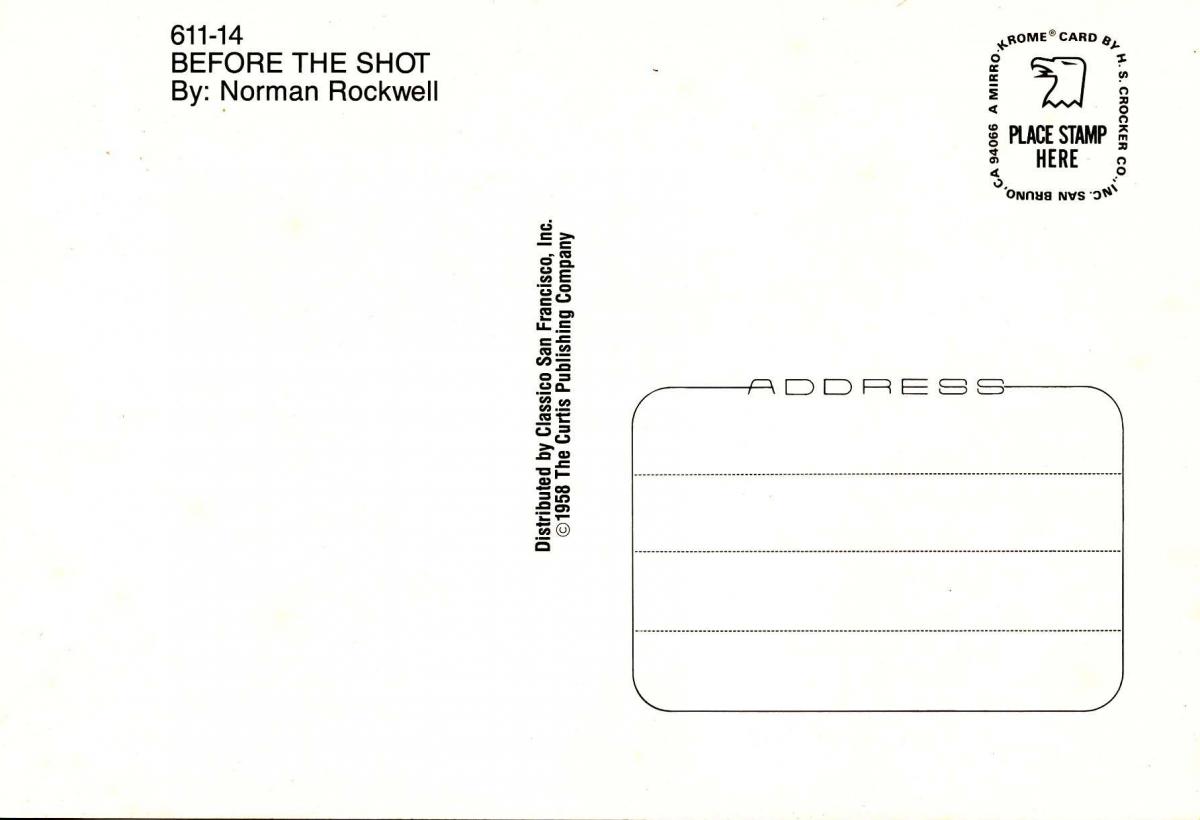 Norman Rockwell - Before the Shot Grading of Postcards MINT (M): Perfect condition, no apparent blemishes, flaws, postally unused, may have some writing on back. NEAR MINT (NM): Like new, image is uncompromised, m ... Read More
