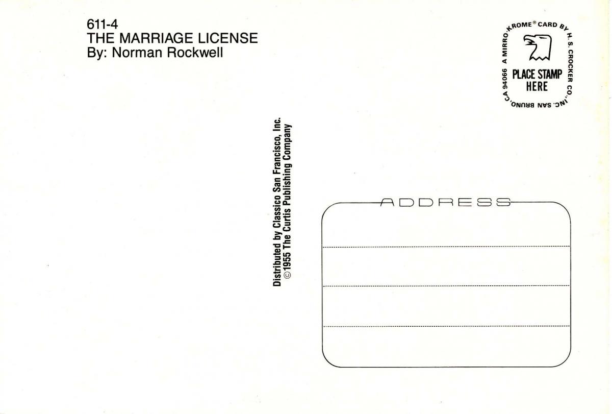 Norman Rockwell - The Marriage License Grading of Postcards MINT (M): Perfect condition, no apparent blemishes, flaws, postally unused, may have some writing on back. NEAR MINT (NM): Like new, image is uncompromis ... Read More