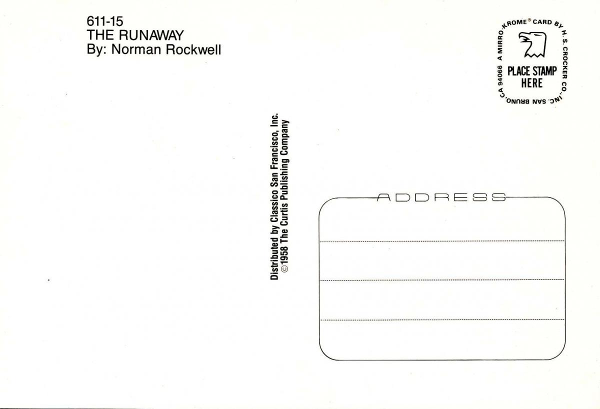 Norman Rockwell - The Runaway Grading of Postcards MINT (M): Perfect condition, no apparent blemishes, flaws, postally unused, may have some writing on back. NEAR MINT (NM): Like new, image is uncompromised, may h ... Read More