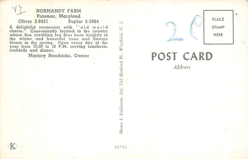 Normandy Farm Potomac, Maryland MD Postcards Postal Date: Unused Grade: 2 Size: Regular Size Postcard - approximately 3 1/2 inch x 5 1/2 inch (9 CM x 14 CM) Grading Scale: Grade 1 = Perfect corners Grade 2 = ... Read More