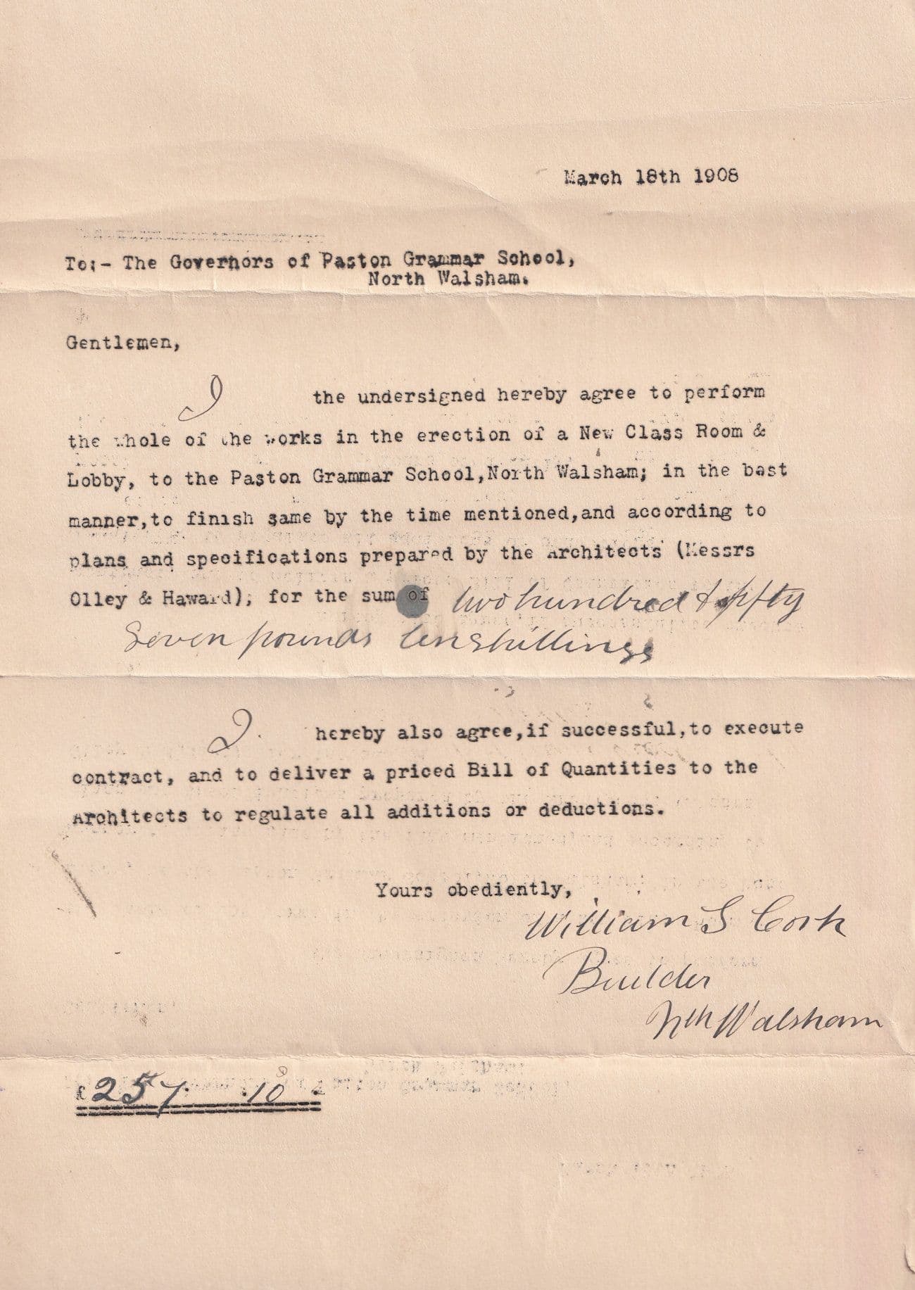 chau3244 Antique 1908 large 12" x7" receipt document and receipt and contract of work for a builder working on North Walsham School signed and folded but very good condition indeed
