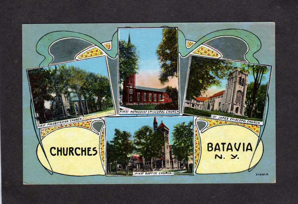 NY Churches Episcopal Methodist Baptist Batavia New York Linen Postcard