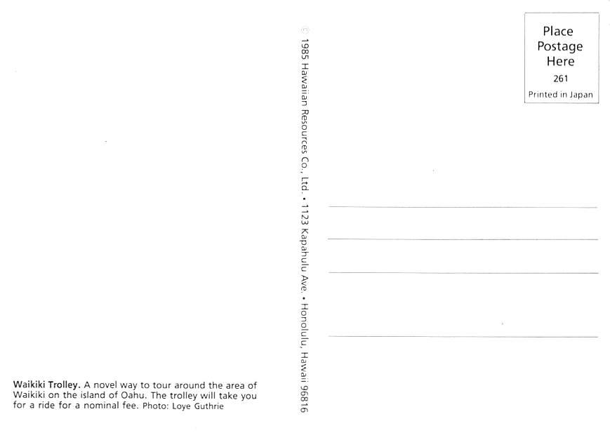 Oahu, Hawaii - Waikiki Trolley 1 Grading Scale: Grade 1 = Perfect corners Grade 2 = Very Minimal corner wear, no creases Grade 3 = Some corner wear, no creases. Grade 4 = Crease Grade 5 = A lot of damage to card. ... Read More