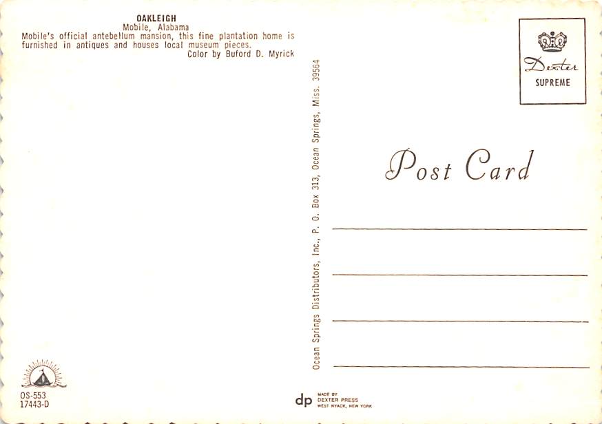 Oakleigh - Mobile, Alabama Grade: 1 Category: Continental Size Postcard, Approx 4 in x 6 in (10 cm x 15.25 cm) Product Size: Continental size: 4X6 inches (10.5 cm x 15 cm) Grading Scale: Grade 1 = Perfect corn ... Read More