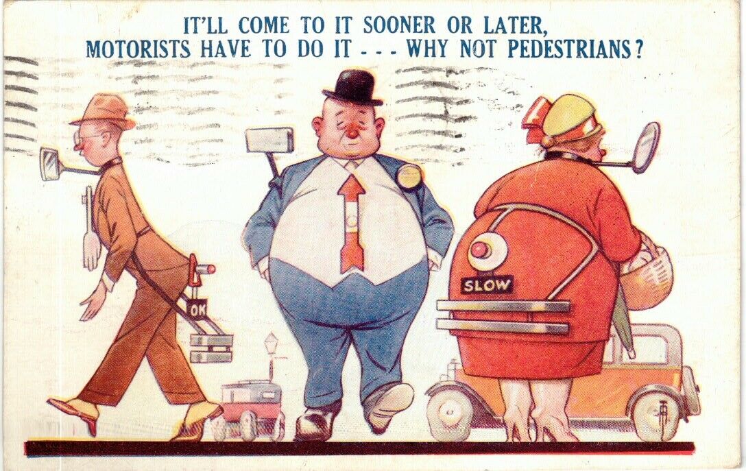 Comic vintage postcard "IT'LL COME TO IT SOONER OR LATER, MOTORISTS HAVE TO DO IT --- WHY NOT PEDESTRIANS? Postmarked 1933.
