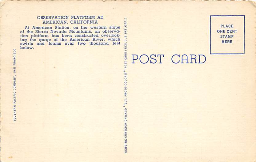 Observation Platform at American Sierra Nevada CA Postcard - Unused Grade: 2 Size: R - Regular size: Approx 3 1/2 X 5 1/2 inch (9 cm X 14 cm) Grading Scale: Grade 1 = Perfect corners Grade 2 = Very Minimal cor ... Read More
