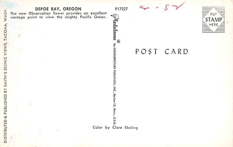 Observation Tower Depoe Bay, Oregon OR Postcard - Unused Grade: 2 Size: R - Regular Size Postcard - approximately 3 1/2 inch x 5 1/2 inch (9 CM x 14 CM) Grading Scale: Grade 1 = Perfect corners Grade 2 = Very M ... Read More