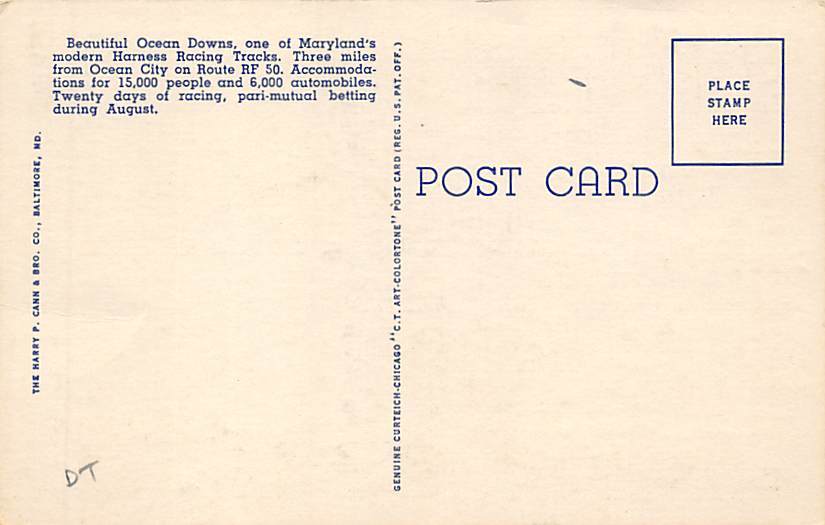 Ocean Downs Raceway Ocean City, Maryland MD Postcards - Unused Grade: 2 Size: R - Regular Size Postcard - approximately 3 1/2 inch x 5 1/2 inch (9 CM x 14 CM) Grading Scale: Grade 1 = Perfect corners Grade 2 = ... Read More