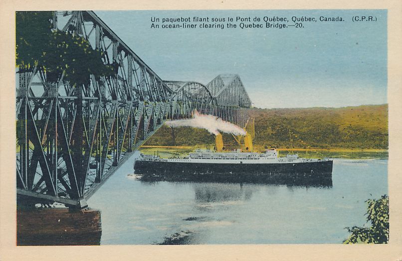 Ocean Liner Steam Ship clearing Quebec Bridge. Quebec, Canada. Printed by the Photogelatine Engraving Co. of Ottawa. Very good condition.