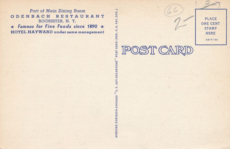 Odenbach Restaurant, Rochester, New York. Standard sized linen post card. The Curt-Teich Dating Guide assigns 4B-H144 to 1944. Very good condition.