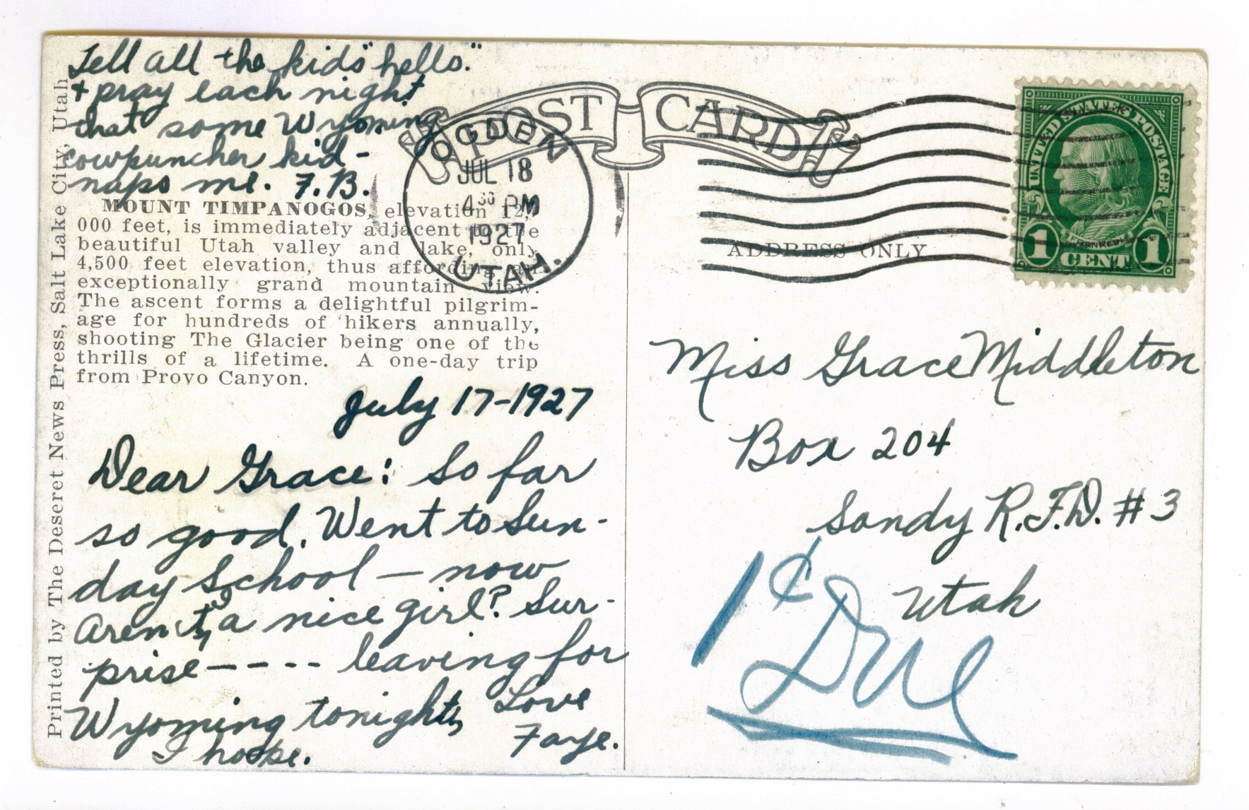 This postcard depicting: 'mount timpanogos' was mailed from ogden, utah to sandy, ut in 1927 franked with a one-cent green benjamin franklin issue tied by a machine cancel. Marked 1c postage due in blue manuscript.Post Card Specifics: 'PRINTED BY THE DESERET NEWS PRESS, SALT LAKE CITY, UTAH.'