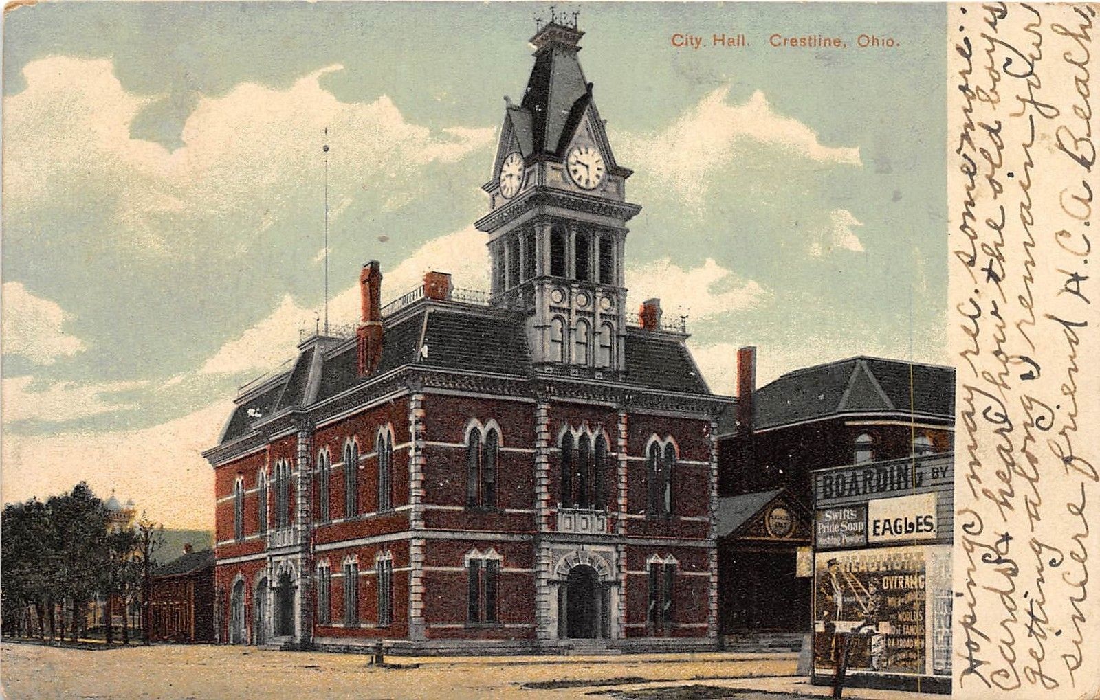 Ohio Postcard 1908 CRESTLINE City Hall Building Store Advertising