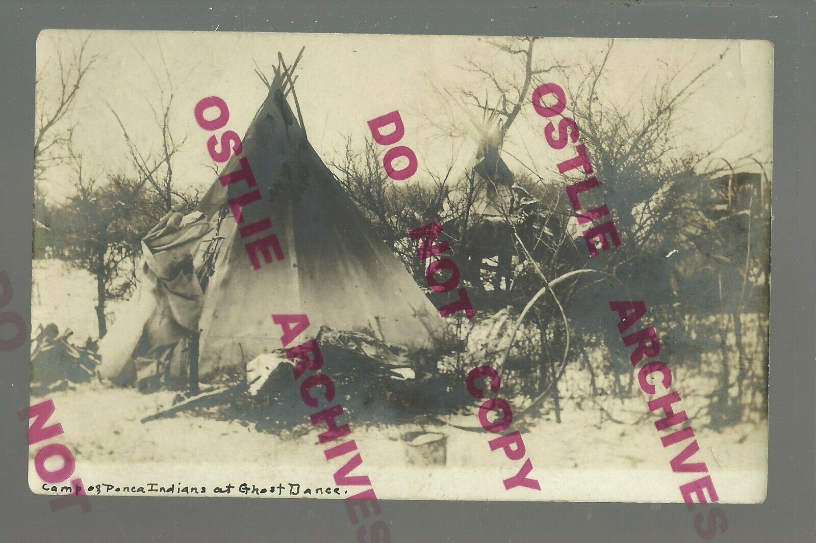 Here is a nice REAL PHOTO postcard view showing CAMP OF PONCA INDIANS AT GHOST DANCE written on the front, same written on back along with LAST JULY, circa 1910----this came with a grouping of Oklahoma Indian cards. *********The OSTLIE ARCHIVES watermark is NOT ON THE CARD----I have been having a number of people copy the images*********** It is in VERY GOOD CONDITION with light wear, smudging, light creasing-----------SEE THE SCANS. THANKS FOR BIDDING!