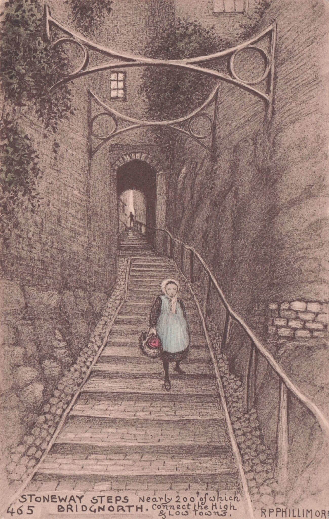 BG650This stunning antique illustrator postcard of this old lady and her basket walking down Bridgnorth Steps is from Victorian born historic art illustrator RP Phillimore described as one of the greatest postcard a ... Read More