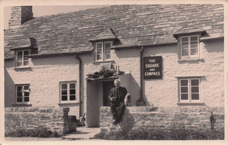 zx154 Antique rare local postcard of the Square And Compass Pub at Dorset showing an elderly man sitting on the pub wall with his dog and pint of beer in hand used franked 1940s in truly outstanding condition.