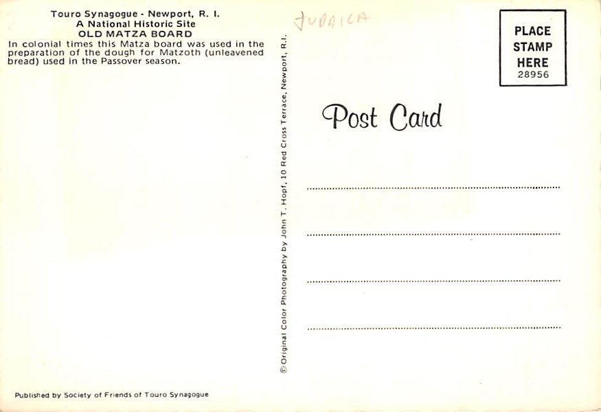 Old Matza Board, Newport, R.I. Postcard - View Images Grade: 1 Size: C - Continental Size Postcard - approximately 4 inch X 6 inch (15 CM X 10.5 CM) Grading Scale: Grade 1 = Perfect corners Grade 2 = Very Minim ... Read More