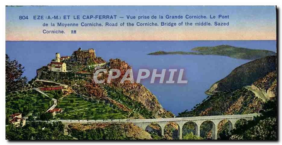 Old Postcard Eze and Cap Ferrat view Taking the Grande Corniche The Bridge on...