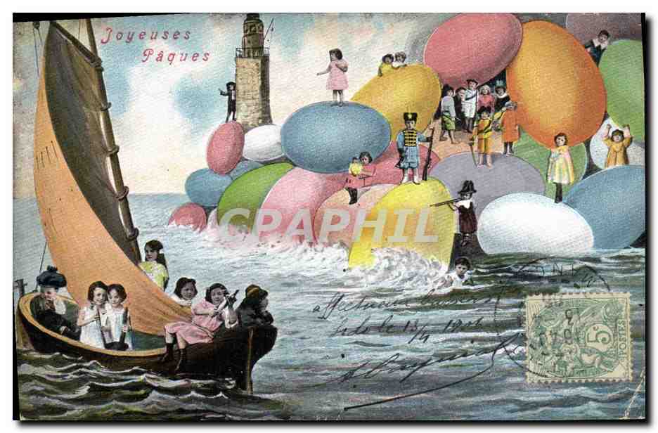Old Postcard Fun Children Bebe Happy Easter Boat