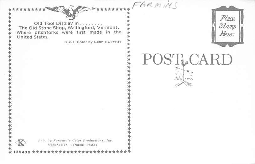 Old Tool Display Wallingford, VT., USA Farming Postcard Unused, Grade: 1, , Size: Regular size: Approx 3 1/2 X 5 1/2 inch (9 cm X 14 cm) Grading Scale: Grade 1 = Perfect corners Grade 2 = Very Minimal corner w ... Read More