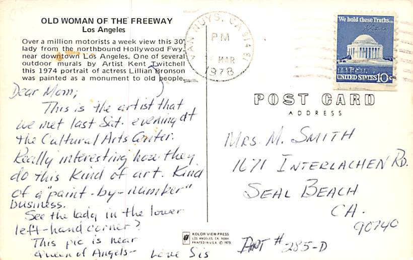 Old Woman of the Freeway Los Angeles CA Postcard - 1978