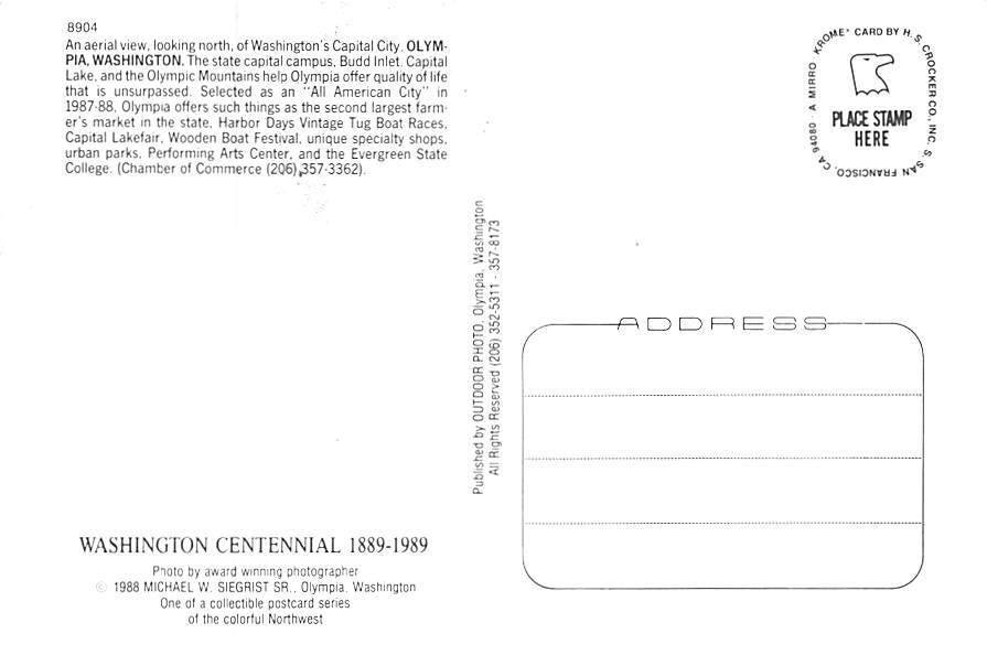 Olympia Washington Grade: 1 Size: Continental Size - approximatly 4 Inch x 6 Inch (15 cm x 10.5) Grading Scale: Grade 1 = Perfect corners Grade 2 = Very Minimal corner wear, no creases Grade 3 = Some corner wea ... Read More