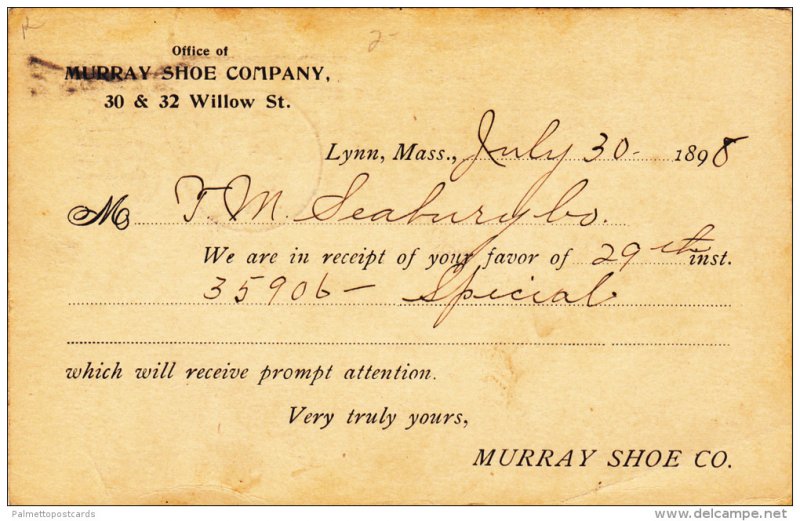 Order Receipt, Murray Shoe Co., Lynn, Massachusetts 1898 :: - Vintage 5.5" x 3.5" Lithograph Postcard, VG+, WOF, WOB, PU1898