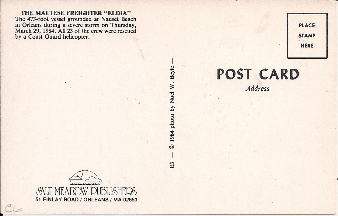 Standard size chrome era postcard from Orleans, Cape Cod, Massachusetts, featuring a view of the wreck of the freighter "Eldia", Nauset Beach, 1984. Good to very good condition, please see both scans.Seller Information