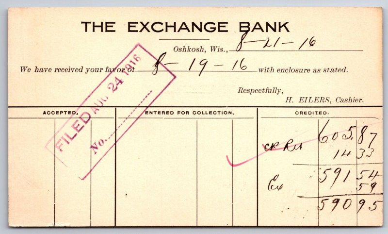 Oshkosh Wisconsin~Exchange Bank Postal~H Eilers Cashier~1916