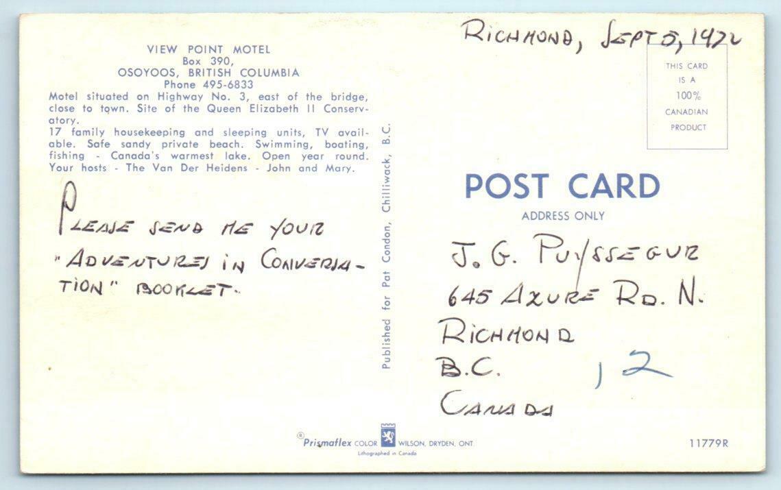 OSOYOOS, British Columbia Canada ~ VIEW POINT MOTEL Roadside 1972 Postcard