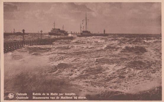 Antique early 1900s postcard of a storm in Ostende at the mailboat entrance used and whilst lightly aged in outstanding condition