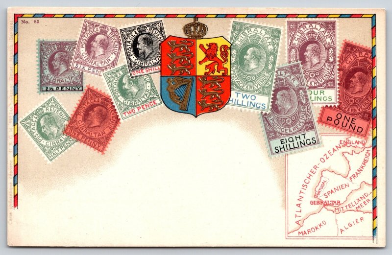 Ottmar Zieher Stamp Postcard~British Gibraltar~Stamps Array~Crest~Crown-Lion~#83
