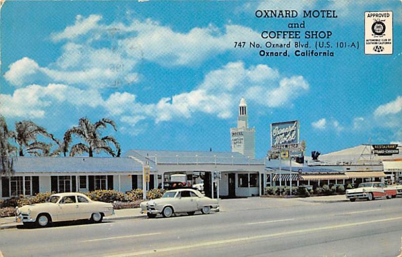 Oxnard Motel and Coffee Shop Oxnard CA Postcard - 1960 Grade: 4 Size: R - Regular size: Approx 3 1/2 X 5 1/2 inch (9 cm X 14 cm) Grading Scale: Grade 1 = Perfect corners Grade 2 = Very Minimal corner wear, no ... Read More