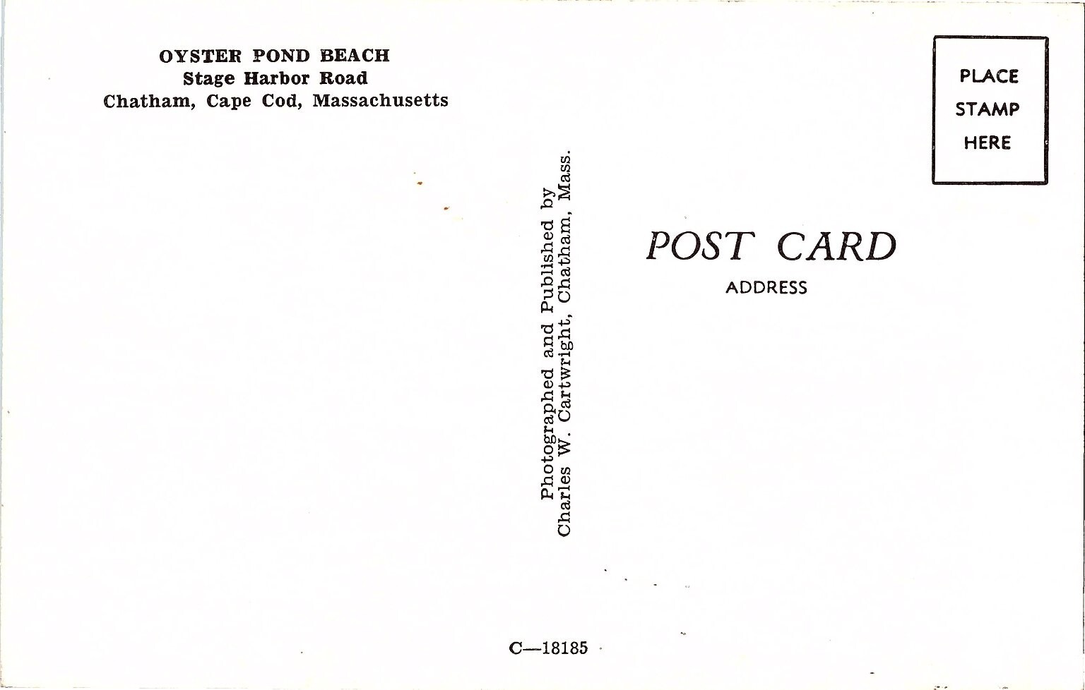 This vibrant vintage postcard captures the scenic Oyster Pond Beach along Stage Harbor Road in Chatham, Cape Cod, Massachusetts. The bright sandy beach and calm waters are bustling with sunbathers and swimmers, set against a backdrop of lush greenery and a clear sky. This postcard showcases a classic mid-20th century photochrome print, illustrating the timeless charm of Cape Cod's coastal beauty.Published and photographed by Charles W. Cartwright of Chatham, Massachusetts, this lithographed postcard is part of a licensed reprint series from the 1960s. Measuring the standard 5.5 x 3.5 inches, it offers a nostalgic glimpse into a popular New England summer destination. Collectors and enthusiasts of regional Americana and vintage travel memorabilia will appreciate the historical and geographical significance of this piece.