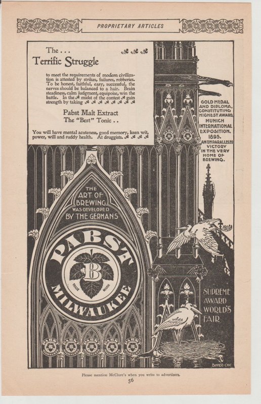 1896 Pabst print advertisement. Original ad, not a reproduction. Size: 6" x 9 1/2" Removed from an 1896 edition of McClure's . Ships in a rigid mailer