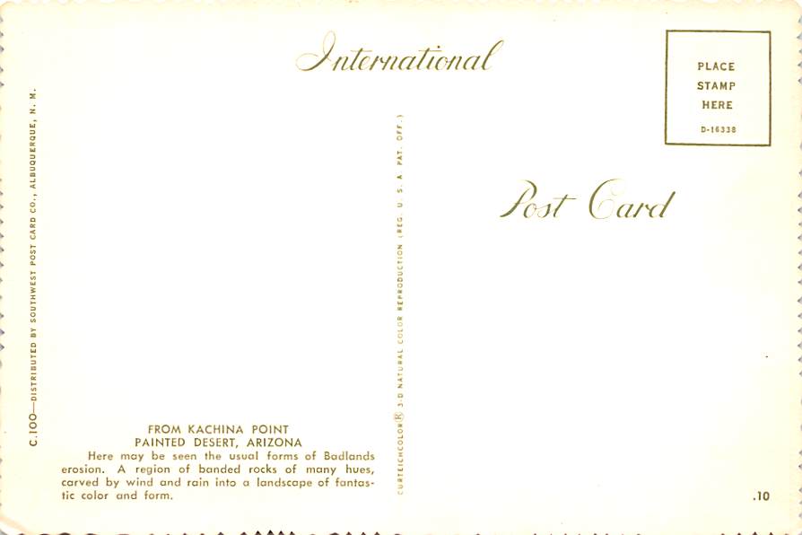 Painted Desert - Arizona Grade: 1 Category: Continental Size Postcard, Approx 4 in x 6 in (10 cm x 15.25 cm) Product Size: Continental size: 4X6 inches (10.5 cm x 15 cm) Grading Scale: Grade 1 = Perfect corner ... Read More