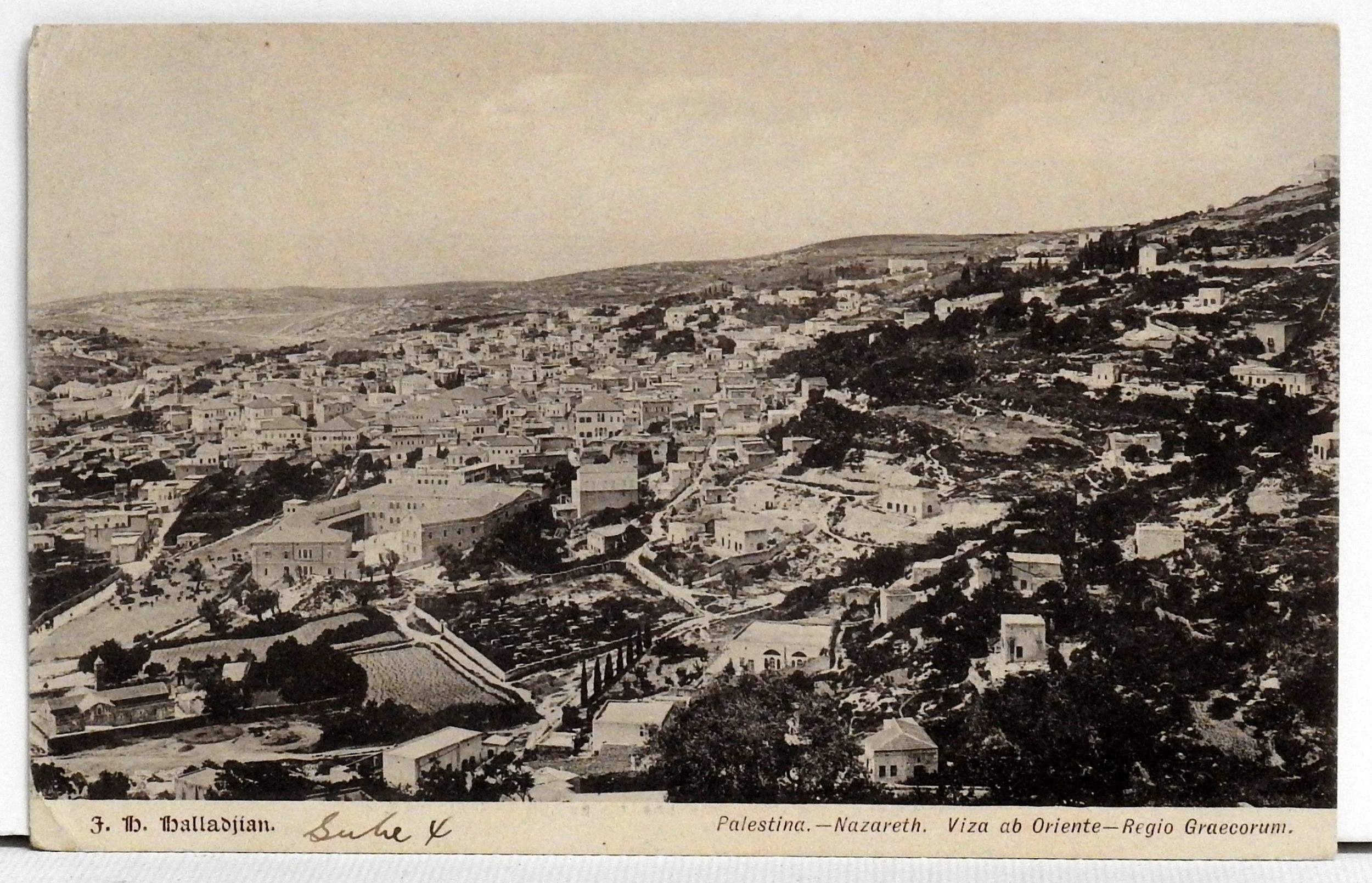 Palestina. Nazareth. Viza ab Oriente-Regio Graecorum. One corner tip is bent. Bemrose & Sons, Printers. Postmarked in Palestine (I believe) and addressed to Chilton, Wisconsin, U.S.A.