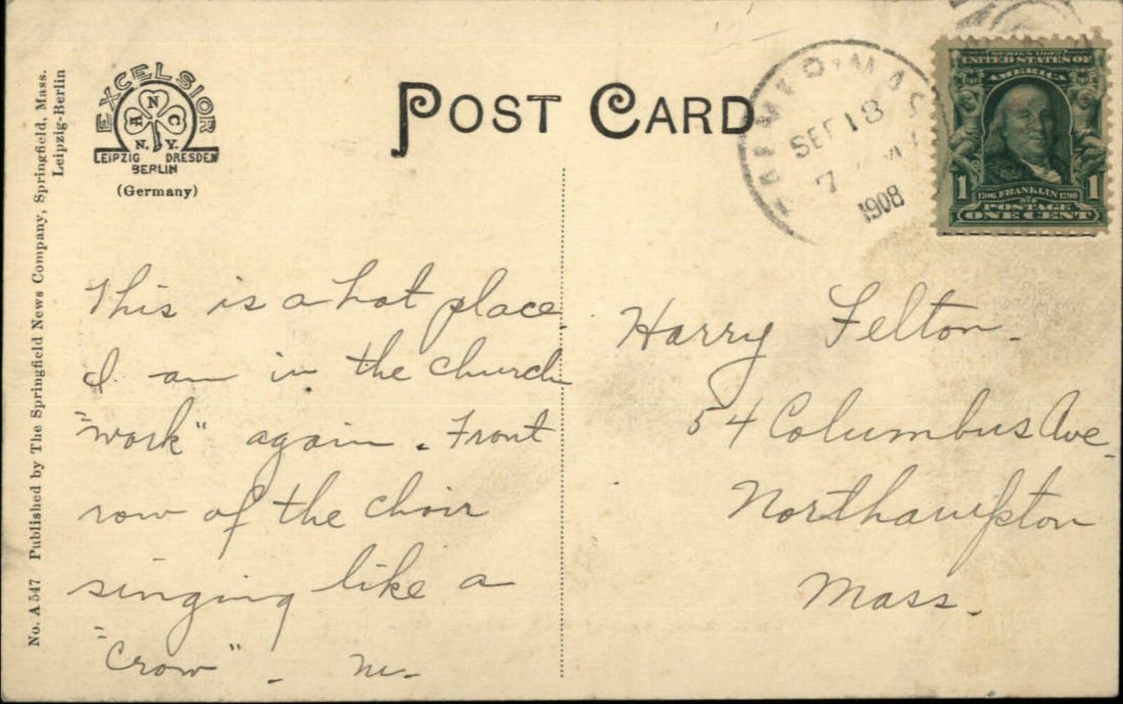 Palmer MA Main St. West Crisp Printed View c1910 Postcard
