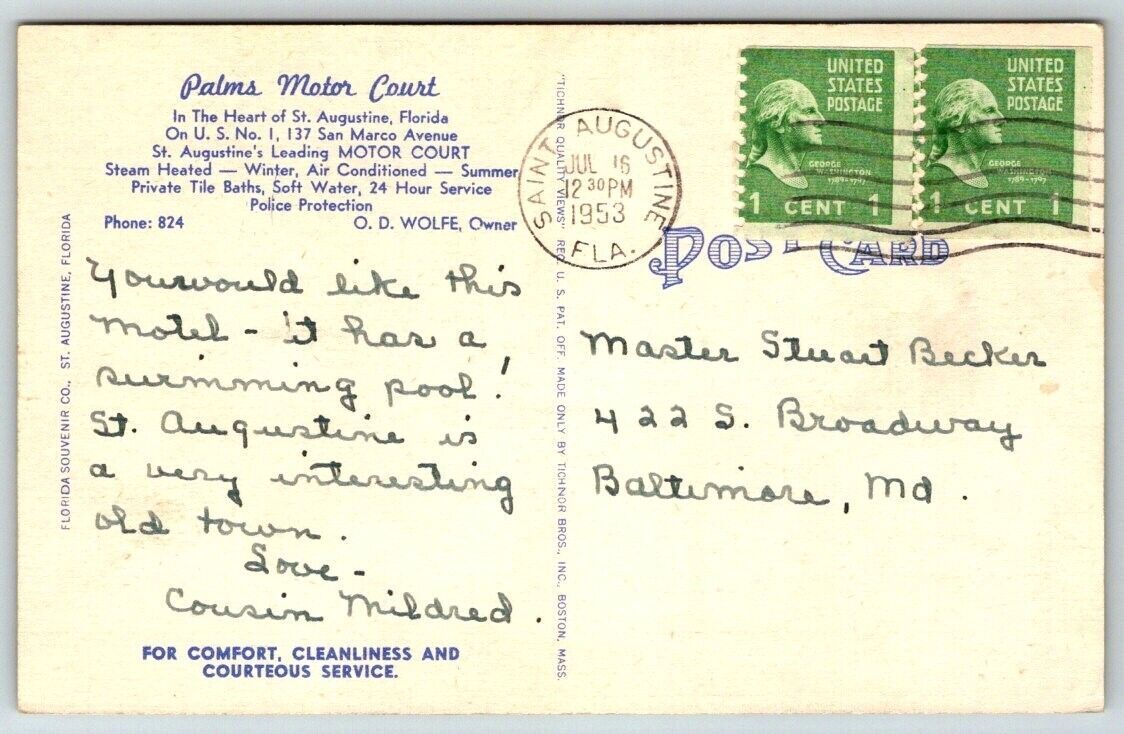 Palms Motor Court St. Augustine Florida 1953 Postcard