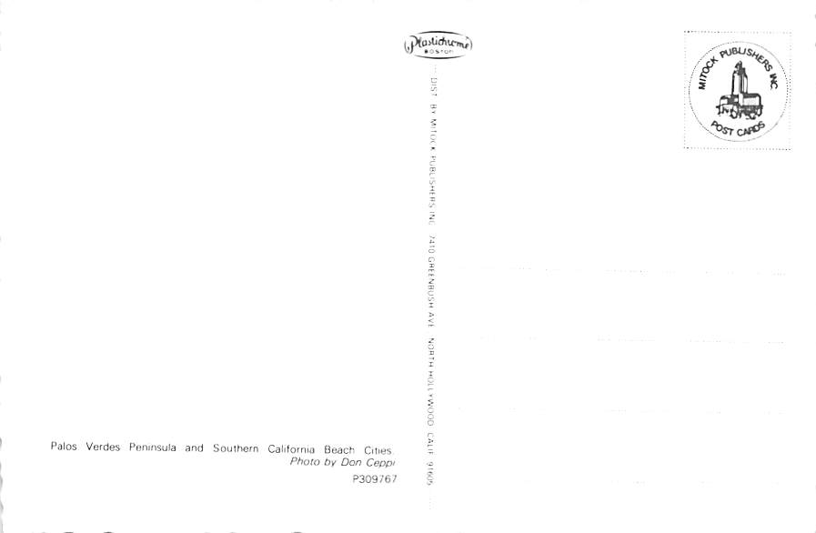 Palos Verdes Peninsula - California Grade: 1 Category: Continental Size Postcard, Approx 4 in x 6 in (10 cm x 15.25 cm) Product Size: Continental size: 4X6 inches (10.5 cm x 15 cm) Grading Scale: Grade 1 = Per ... Read More