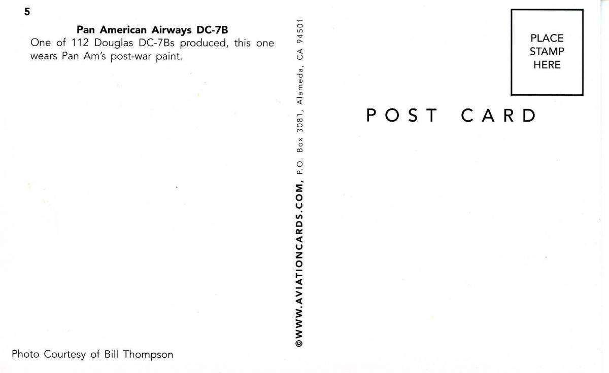 Pan American Airways. DC-7B Grading of Postcards MINT (M): Perfect condition, no apparent blemishes, flaws, postally unused, may have some writing on back. NEAR MINT (NM): Like new, image is uncompromised, may hav ... Read More