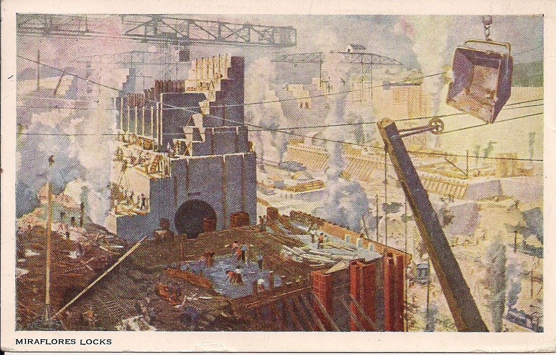 Standard size white border postcard from the Panama Canal Zone, featuring an artist's view of the Miraflores Locks under construction. Postmarked 1932. Good to very good condition, please see both scans.