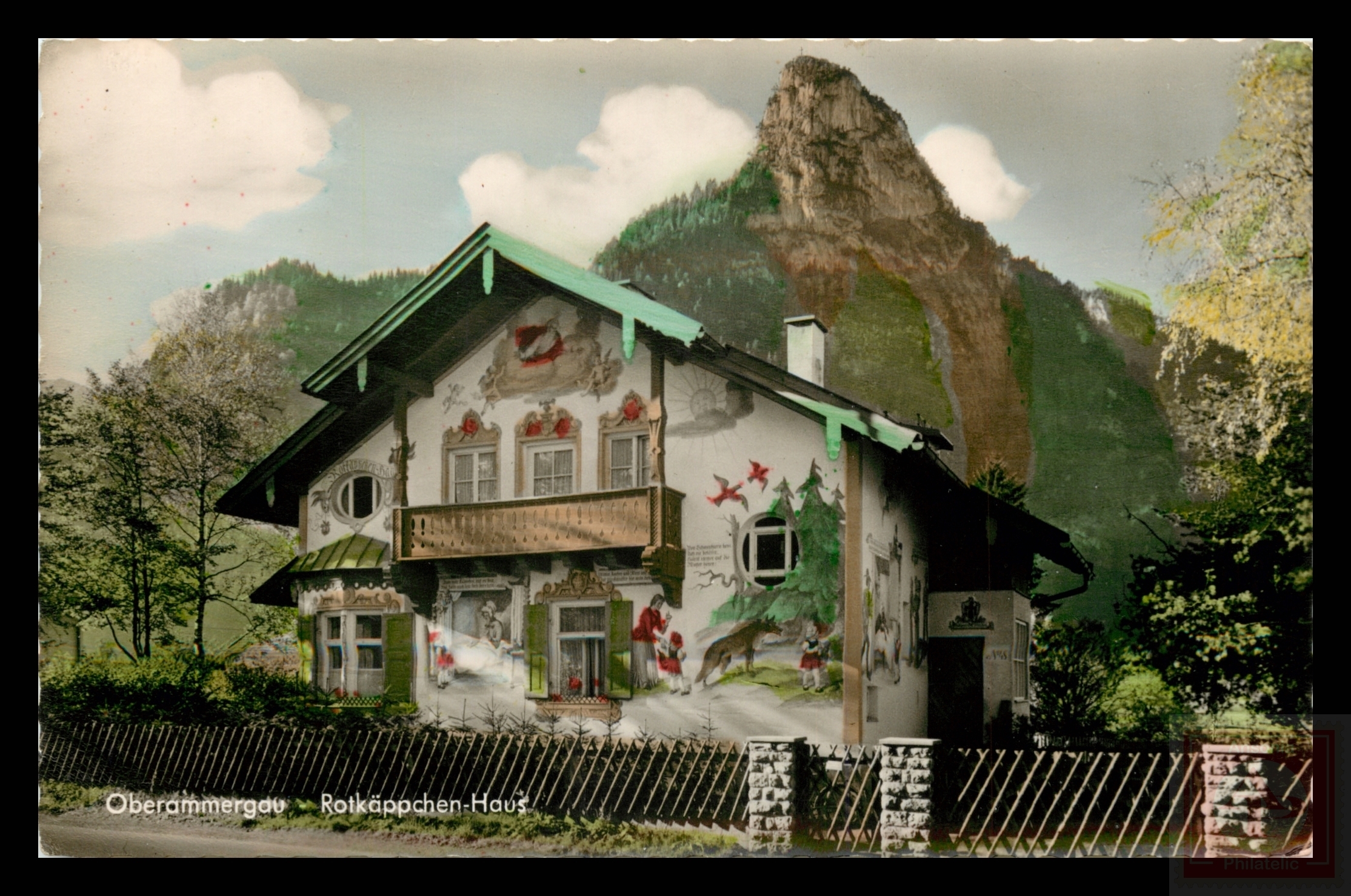 Some scans of postcards result in colored streaks which are a result of the error in scanning and not a fault of the postcard.