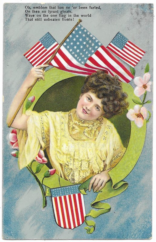 Patriotic Beautiful Lady waving American flags. Mailed 1909, embossedSeller Information