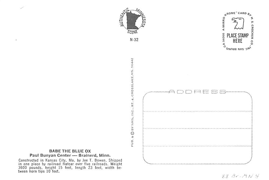 Paul Bunyan and Babe - Brainerd, Minnesota Grade: 1 Category: Continental Size Postcard, Approx 4 in x 6 in (10 cm x 15.25 cm) Product Size: Continental size: 4X6 inches (10.5 cm x 15 cm) Grading Scale: Grade ... Read More