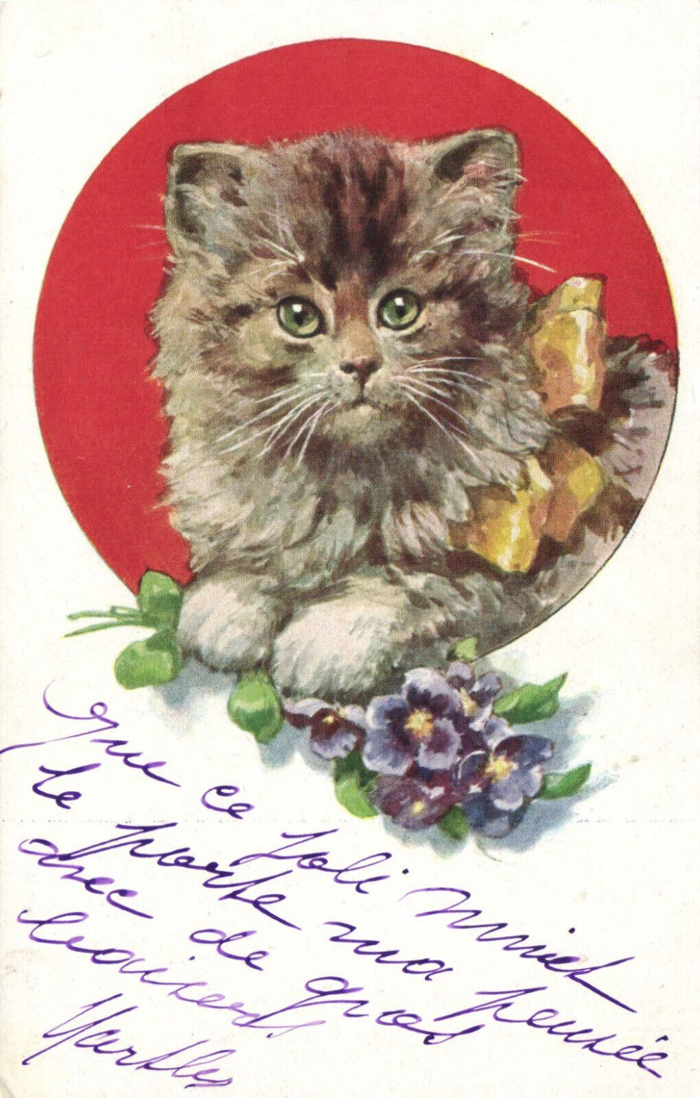 PC CATS, SMALL CAT WITH YELLOW RIBBON AND FLOWERS, Vintage Postcard (b47142)