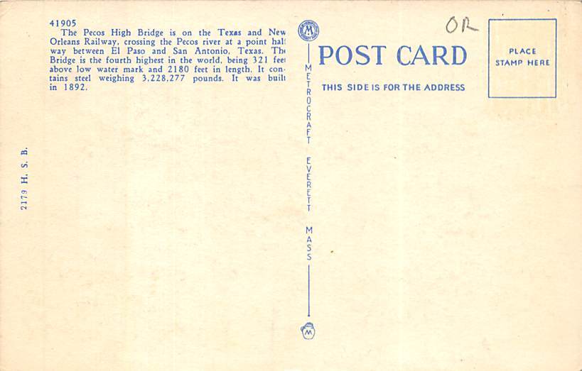 Pecos High Bridge Postal Date: View Images Grade: 1 Size: Regular Size Postcard - approximately 3 1/2 inch x 5 1/2 inch (9 CM x 14 CM) Grading Scale: Grade 1 = Perfect corners Grade 2 = Very Minimal corner wea ... Read More