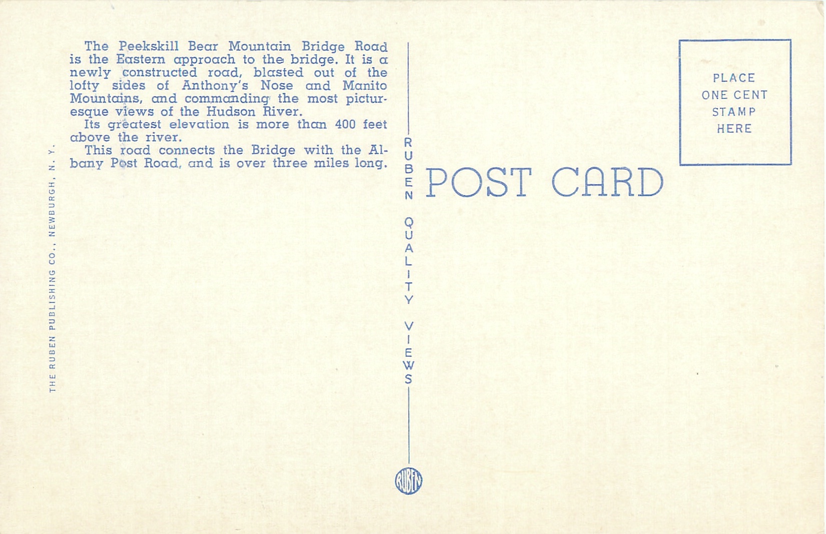 Peekskill New York Bear Mountain Bridge & Winding Road White Border Unused Condition: No major wear. Please see photos. Publisher: Ruben Publishing Co Ships in a sturdy mailer.