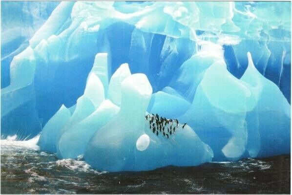 Penguin Group on Blue Ice Glacier or Iceberg Postcard