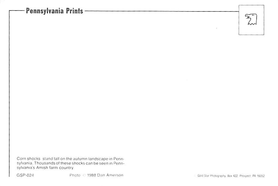 Pennsylvania - Corn Shocks Grade: 1 Category: Continental Size Postcard, Approx 4 in x 6 in (10 cm x 15.25 cm) Product Size: Continental size: 4X6 inches (10.5 cm x 15 cm) Grading Scale: Grade 1 = Perfect corn ... Read More